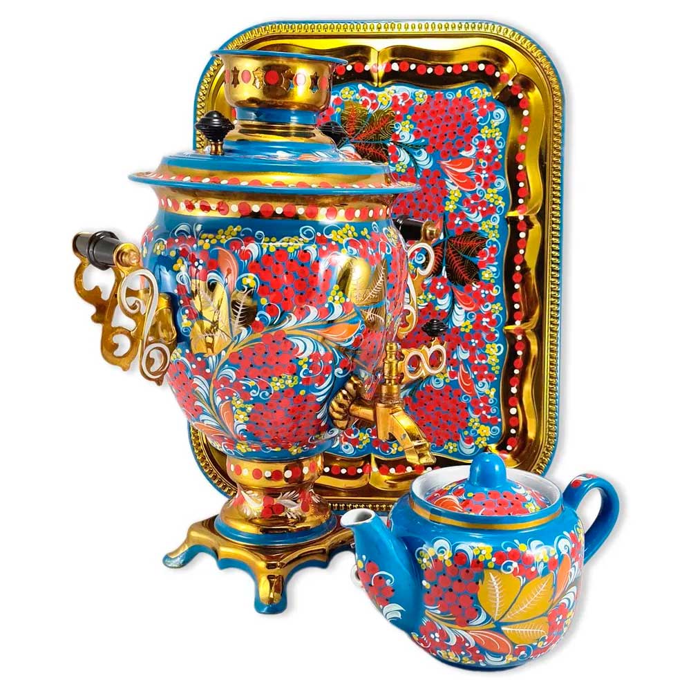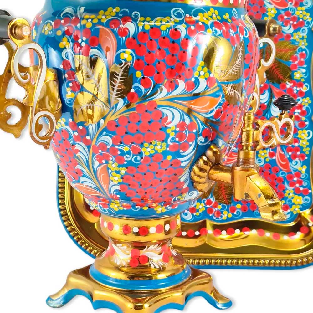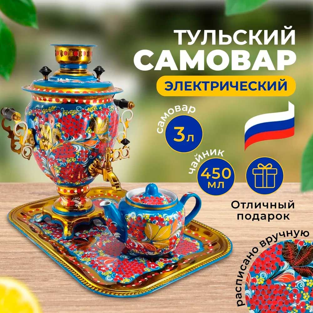Samovar electric, Khokhloma painting, Acorn, 3 liters You can buy a samovar in the style of Khokhloma painting with delivery by courier in Moscow or by mail to any region of Russia or the world. The set includes an electric samovar, a ceramic teapot and a metal tray.Похожие товары: $222.40