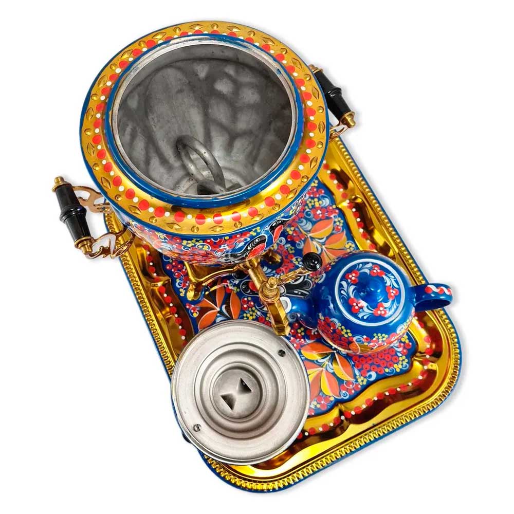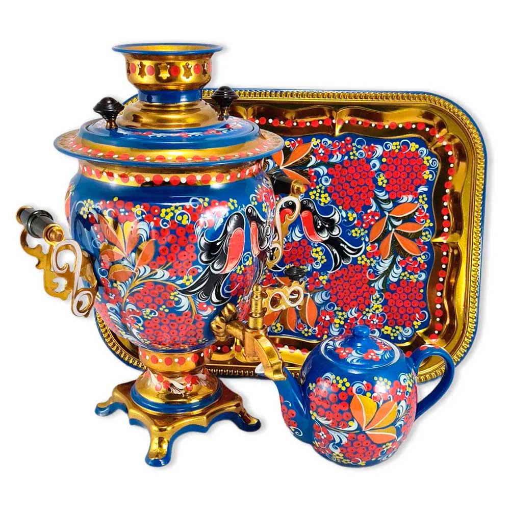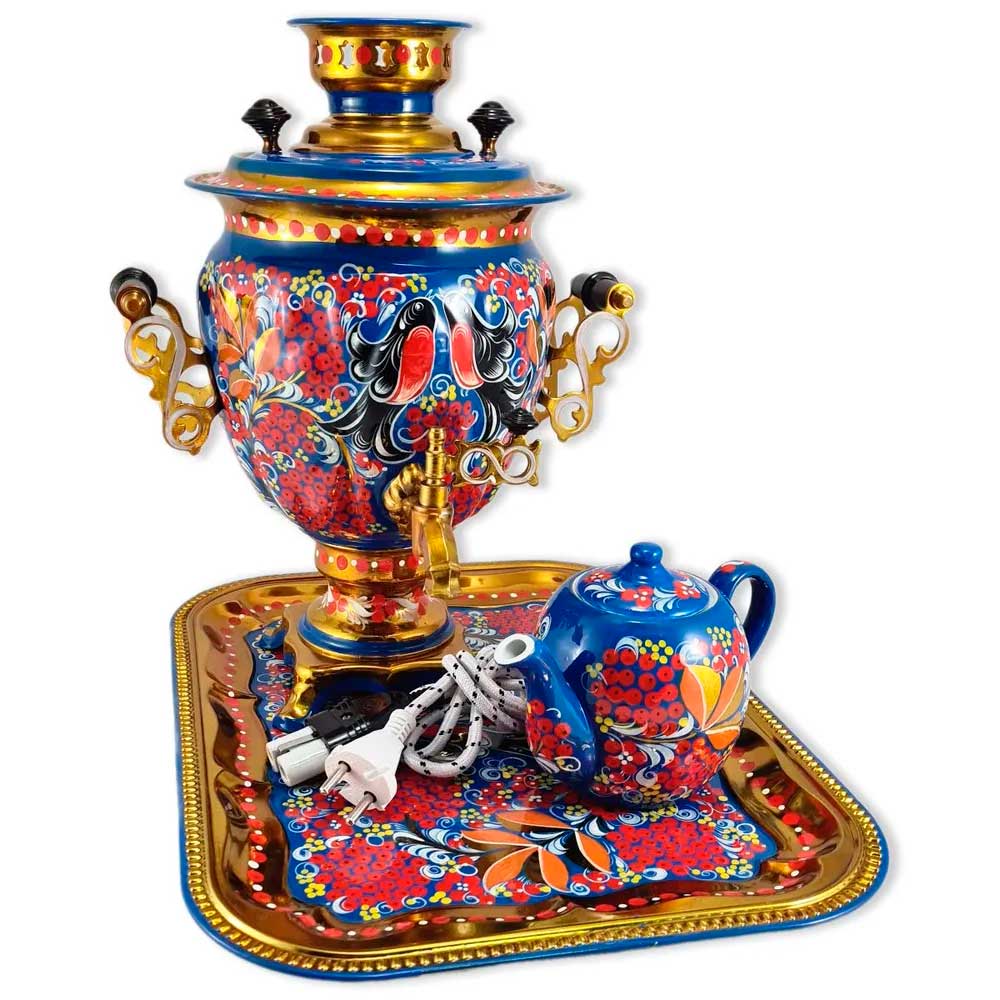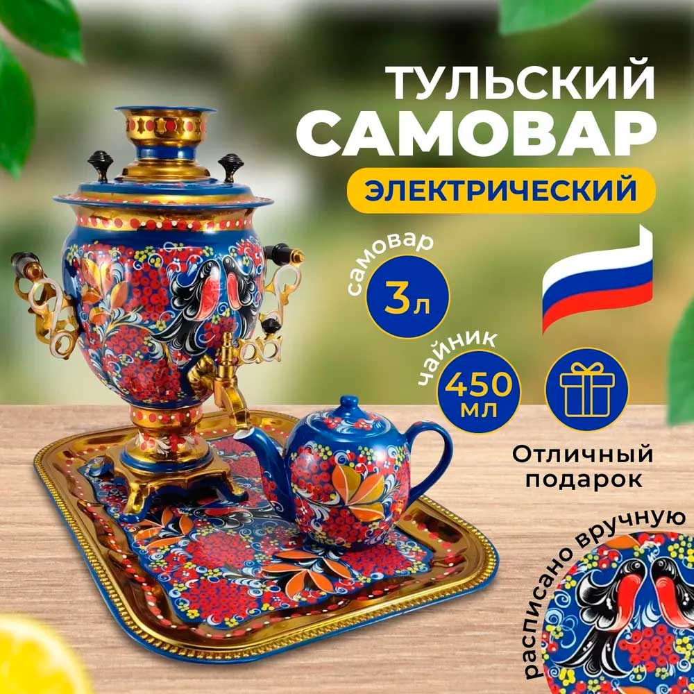 Samovar Tula electric, Khokhloma painting of Bullfinch on mountain ash b Acorn, 3 liters You can buy a samovar in the style of Khokhloma painting with delivery by courier in Moscow or by mail to any region of Russia or the world. The set includes an electric samovar, a ceramic teapot and a metal tray.Похожие товары: $284.15